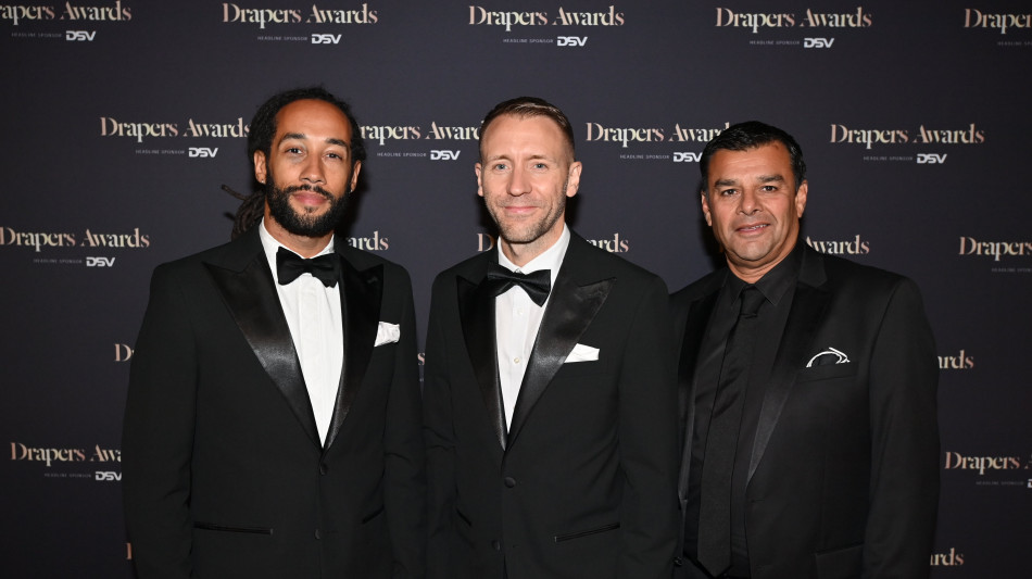 U.S. Polo Assn./Brand Machine U.K. Team, Daniel Windross (L), Mathew Guinchard (M), Boo Jalil (R), accepting the Drapers Award for 'International Excellence' at the Awards Ceremony at The HAC in London, England