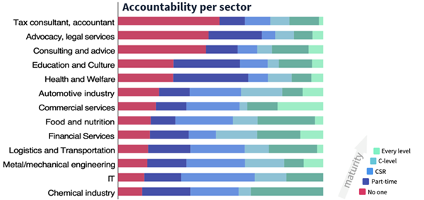 Anche se non ci sono differenze sostanziali tra i Paesi, quasi metà delle aziende europee non possiede una politica o un manager dedicati a ESG o CSR. L'industria manifatturiera spicca per la sua grande maturità nei confronti di questi argomenti, mentre il settore dei servizi è particolarmente indietro.